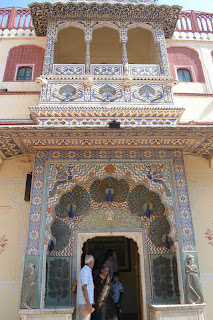 El Chowk está adornado por cuatro puertas; la más hermosa, obviamente la del pavo real, que no pude dejar de mirar .... aun cuando no paraba de circular la gente y no tengo ni una toma decente ... las otras dedicadas al loto, a la rosa y al agua (me da la impresión), representaban cada una de las estaciones del año.